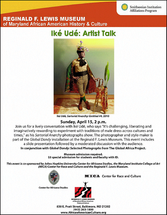 Posted on April 11, 2012 by FredBMORE: ART: Artist Talk with IKE UDE, Sunday 2pm @ Reg. F Lewis Museum PLEASE DISTRIBUTE WIDELY. Hope to see you there! image002 ikeude sartorialanarchy4 IkeUde_April_15_2pm.pdf Share this: Email a link to a friend (Opens in new window) Email Print (Opens in new window) Print Share on Facebook (Opens in new window) Facebook Share on X (Opens in new window) X Share on Reddit (Opens in new window) Reddit Like this:Like Loading...