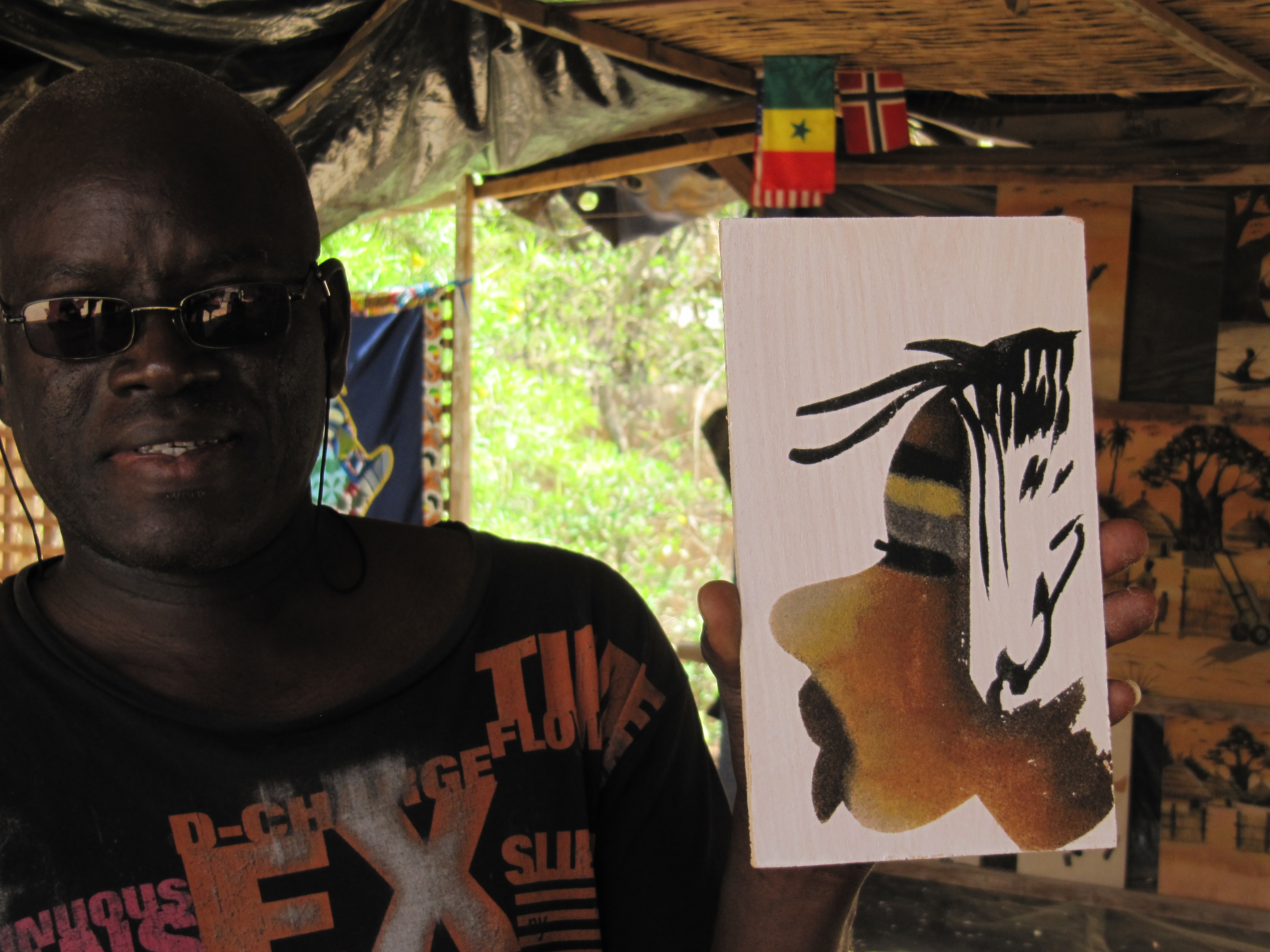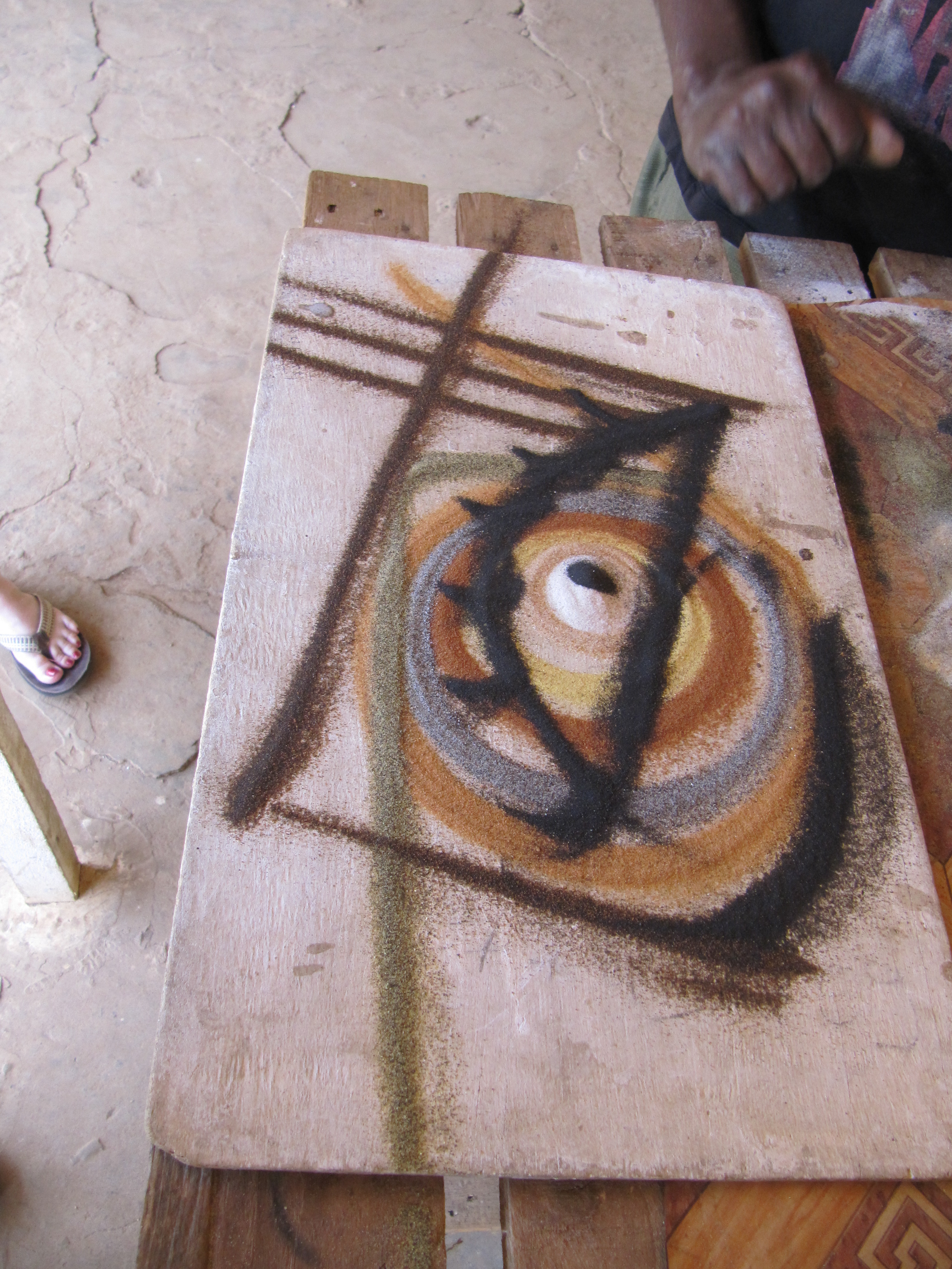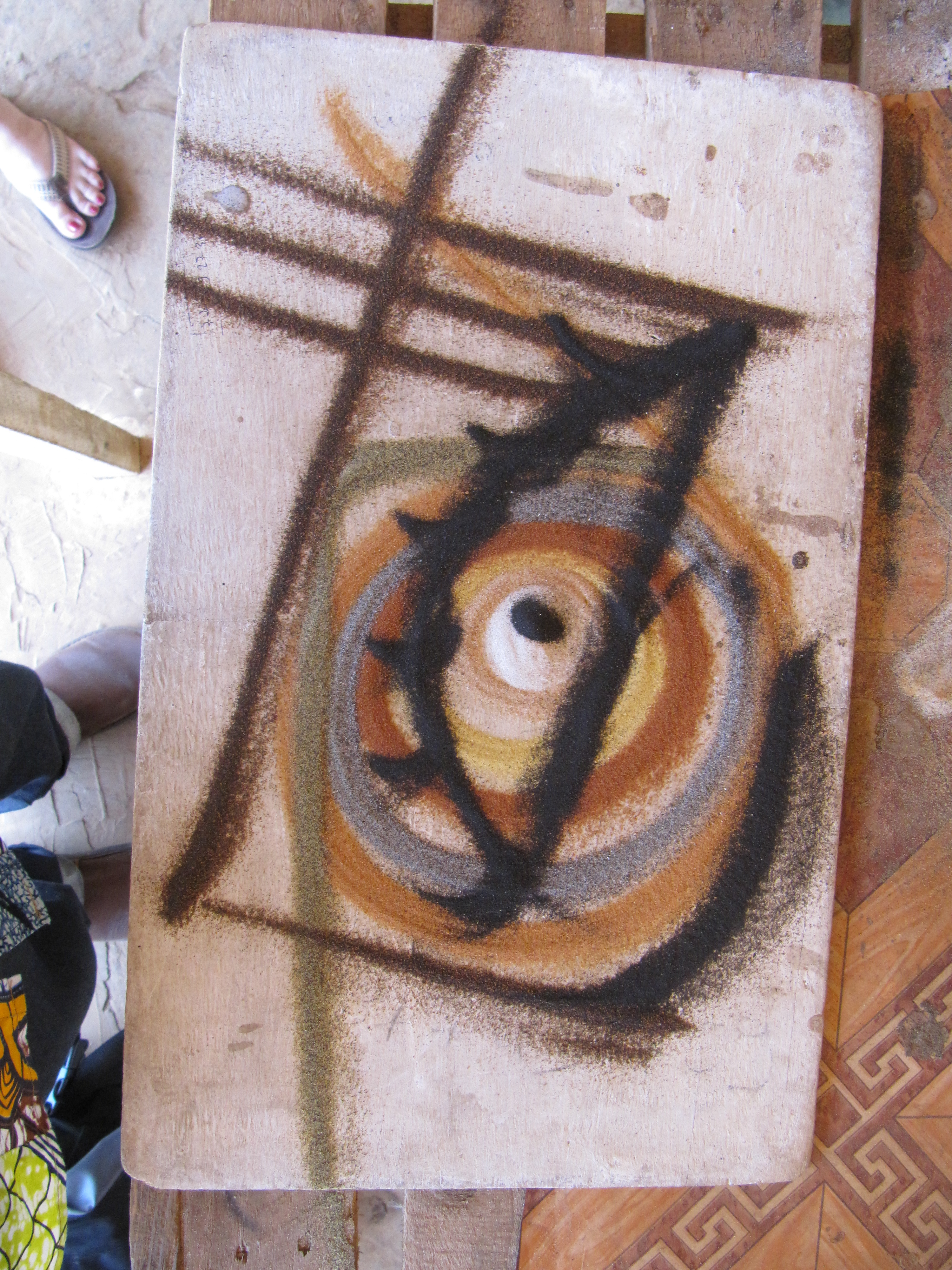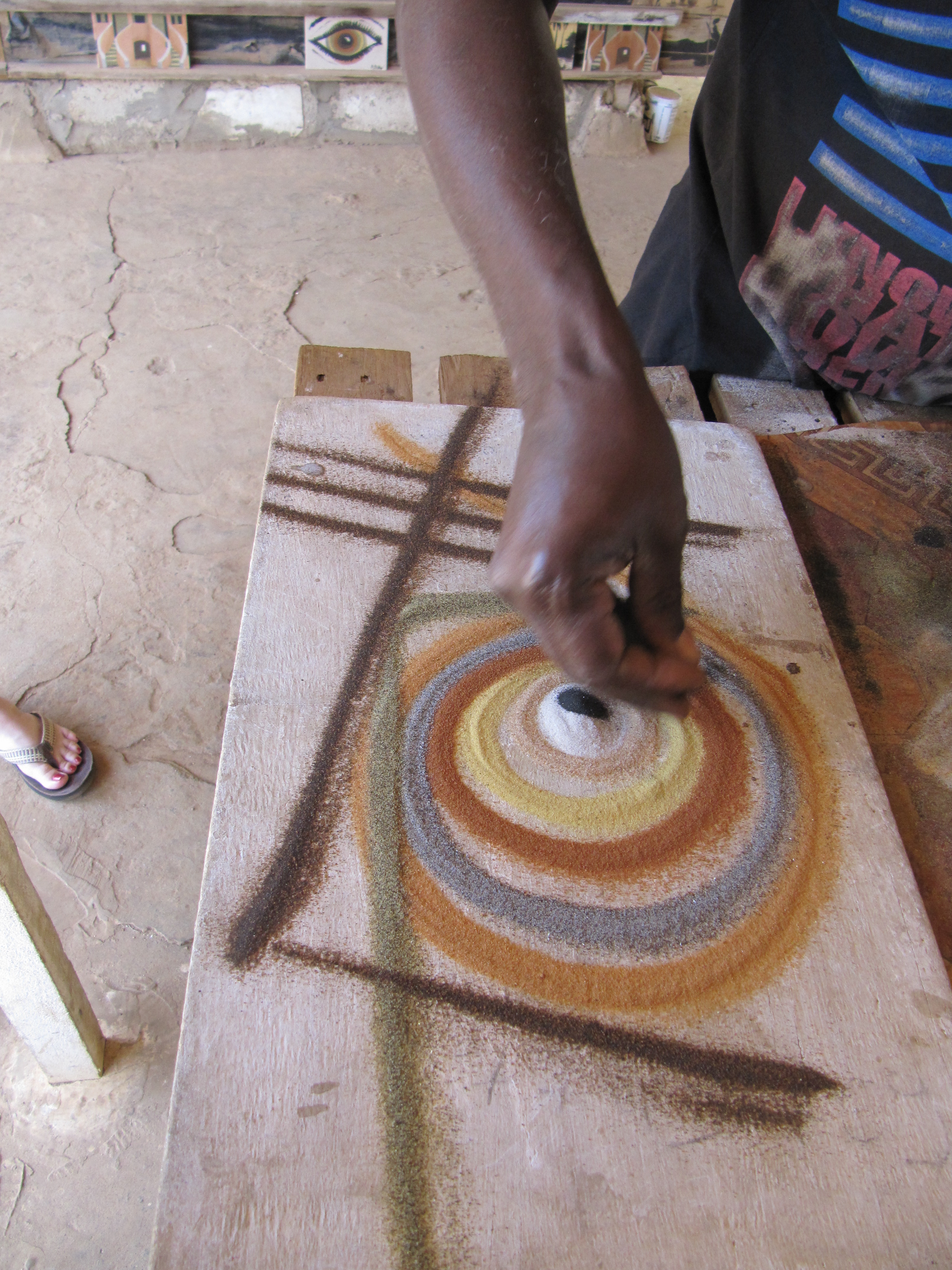 Below are a few photos of a quick “sketch” that Diop did to showcase the wide variety of sand that is used to give color and texture to these sand paintings. Every color that you see on the wood is a sand that occurs naturally in terrain of Senegal, from grey-blue to the volcanic black…